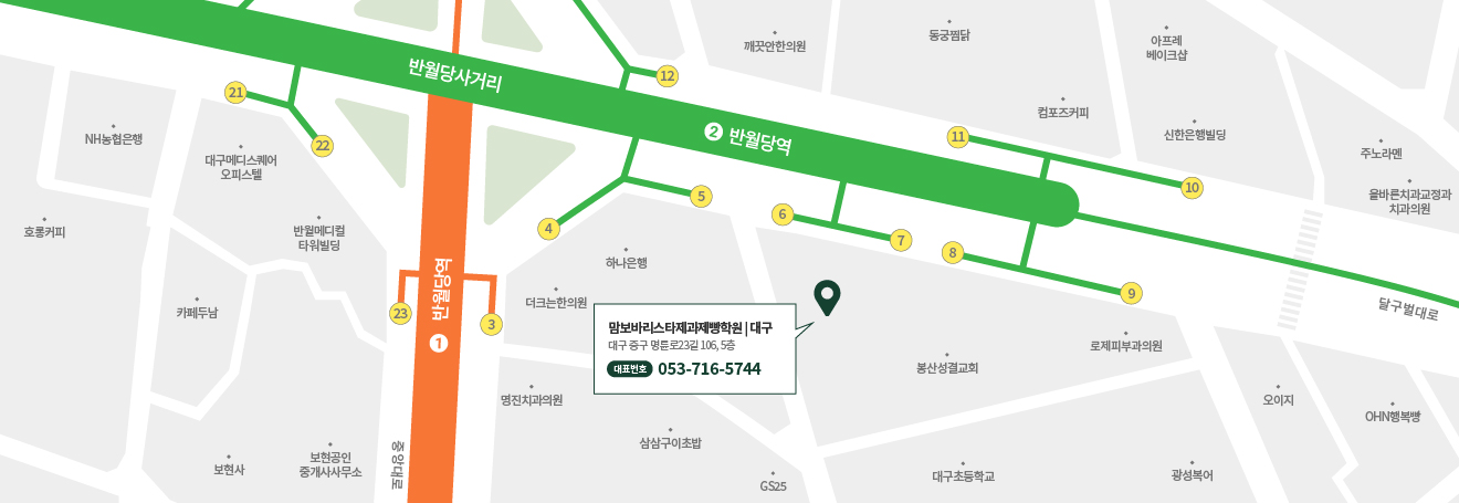 대구 1호선, 2호선 반월당역 5, 6번출구 앞에 위치하고 있습니다.