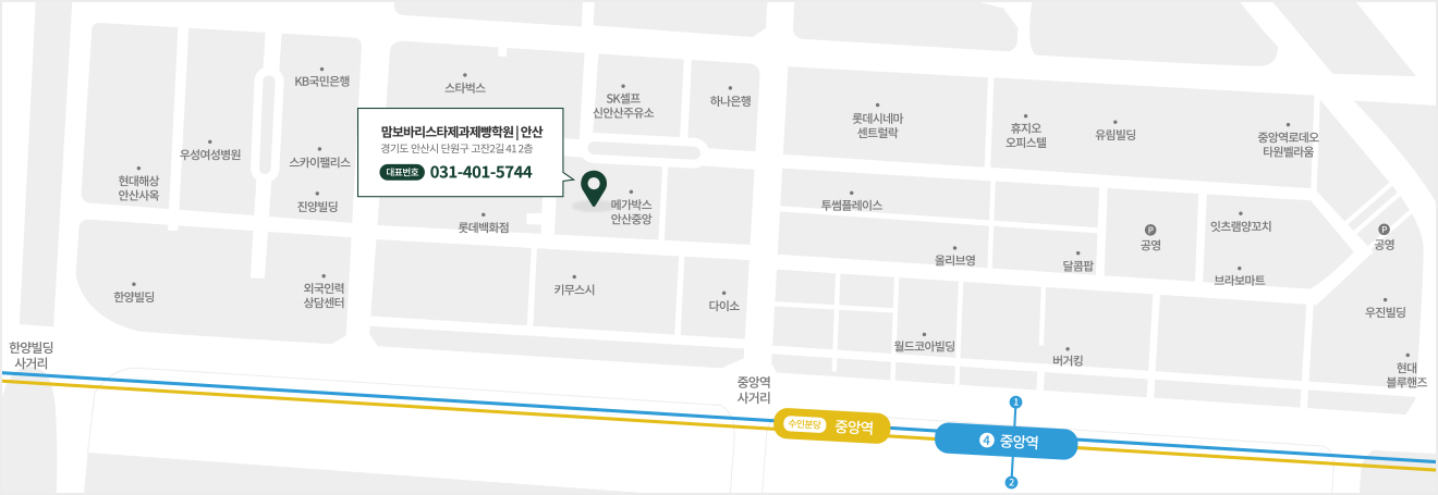 4호선, 수인분당 중앙역 1번출구에서 도보 5분 거리에 위치하고있습니다