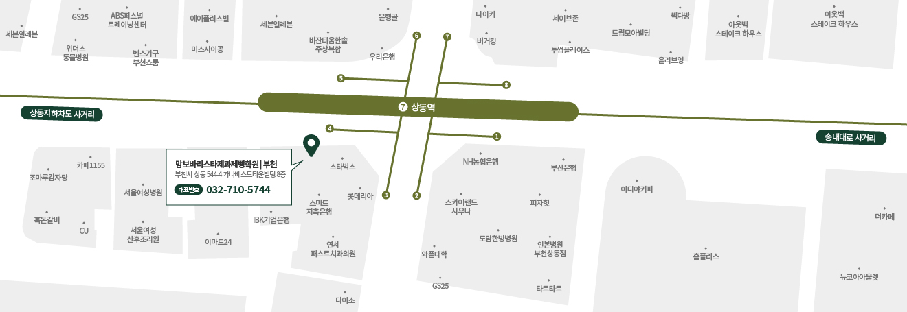상동역 3번, 4번출구 바로 연결되는 건물에 위치하고 있습니다.