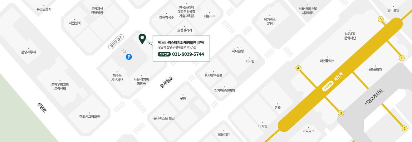 수인분당선 서현역 4번출구에서 5분거리에 위치하고 있습니다.