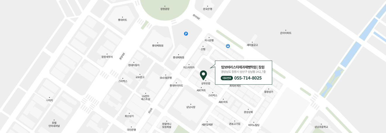 상남시장 도보 2분 거리에 위치하고 있습니다. (상무 초밥 건물 7층)